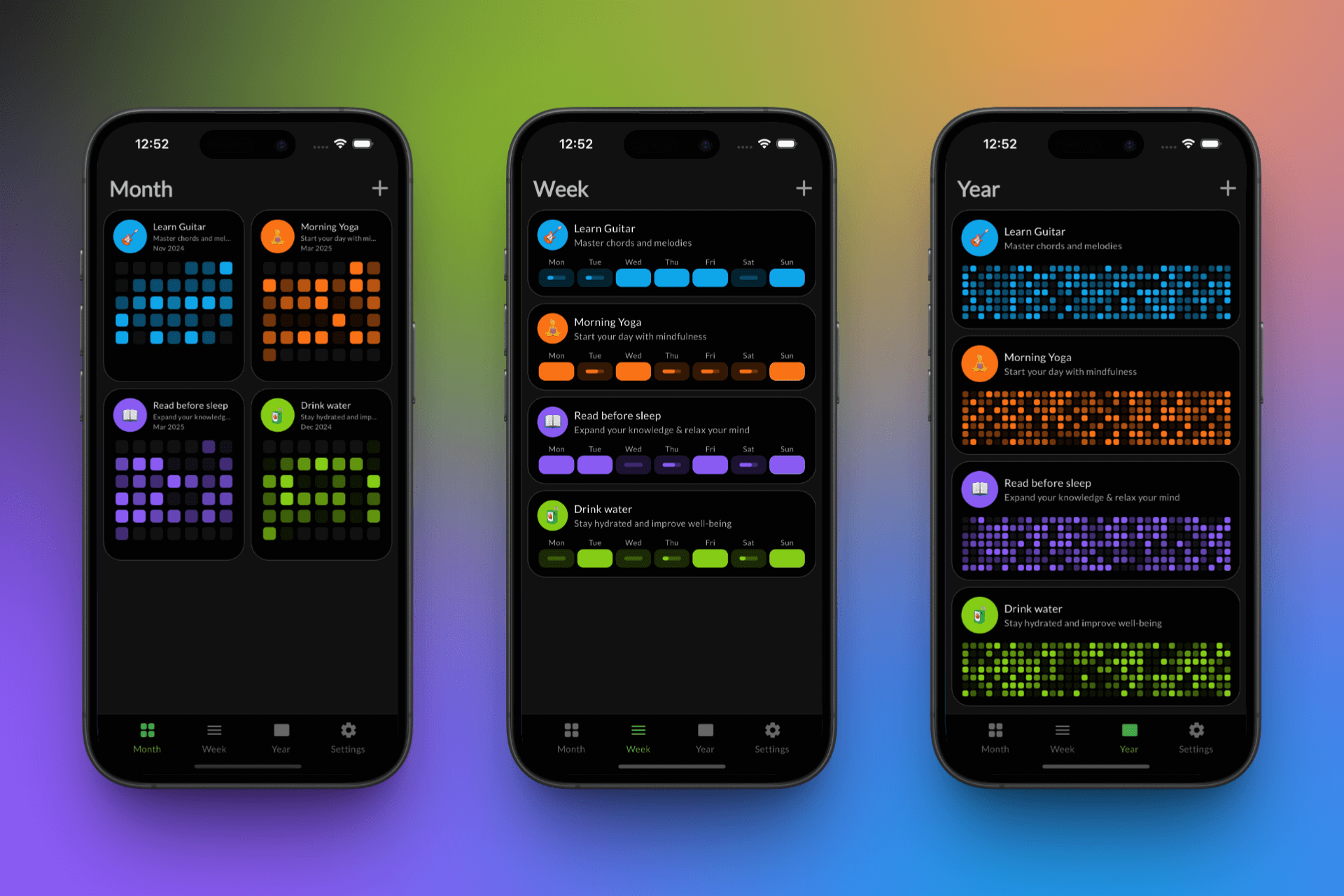 Keep tabs on your daily routines with easy-to-read visual grids. Aim to complete your habits consistently and embrace a better lifestyle.